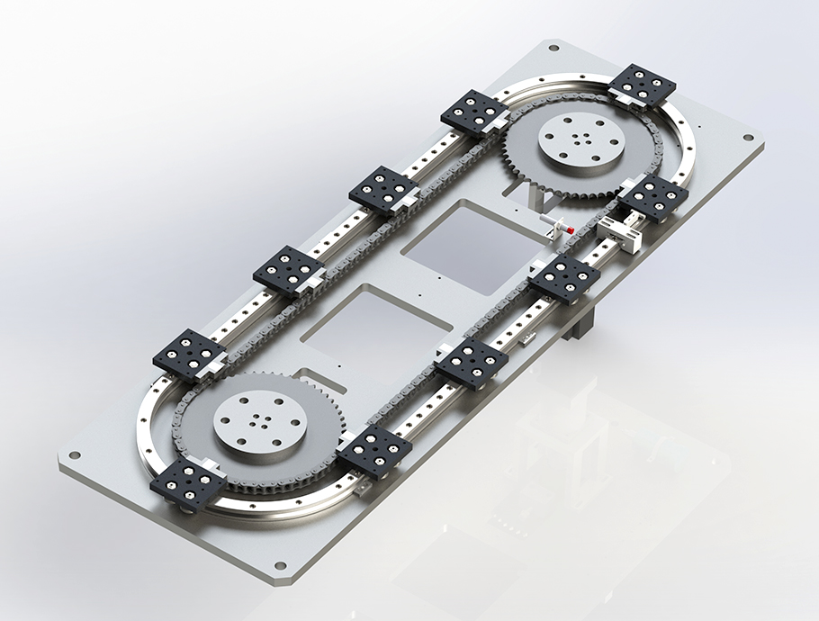 凯铭科技提供非标定制精密自动化环形导轨输送线 高速圆形轨道工作台。滚轮导轨和滚轮圆弧导轨又名滚轮弧形导轨,可组成精密环形导轨;再加上驱动系统,就可以组成精密环形流水线,环形生产线或环