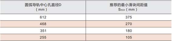 如果相邻两滑块间距太小,会出现多于一个滑块同时停留在圆弧导轨段上,这会不利于对滑块进行定位,所以,对于不同大小的圆弧导轨,存在一个推荐的滑块间距最小值,见下表: